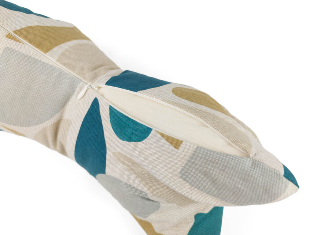 Ein stilvoller Blickfang mit nostalgischem Charme: Das abstrakte Muster aus geschwungenen Formen und Kreisen in Petrol, Türkis, Khaki und Grau versprüht charmanten Retro-Flair, wie ein liebevoller Gruß aus den Designwelten der 50er-Jahre. Auf dem hellbeigen Hintergrund in Leinenoptik kommen die Farben besonders schön zur Geltung und machen dieses Kissen zu einem besonderen Wohnaccessoire mit Charakter.